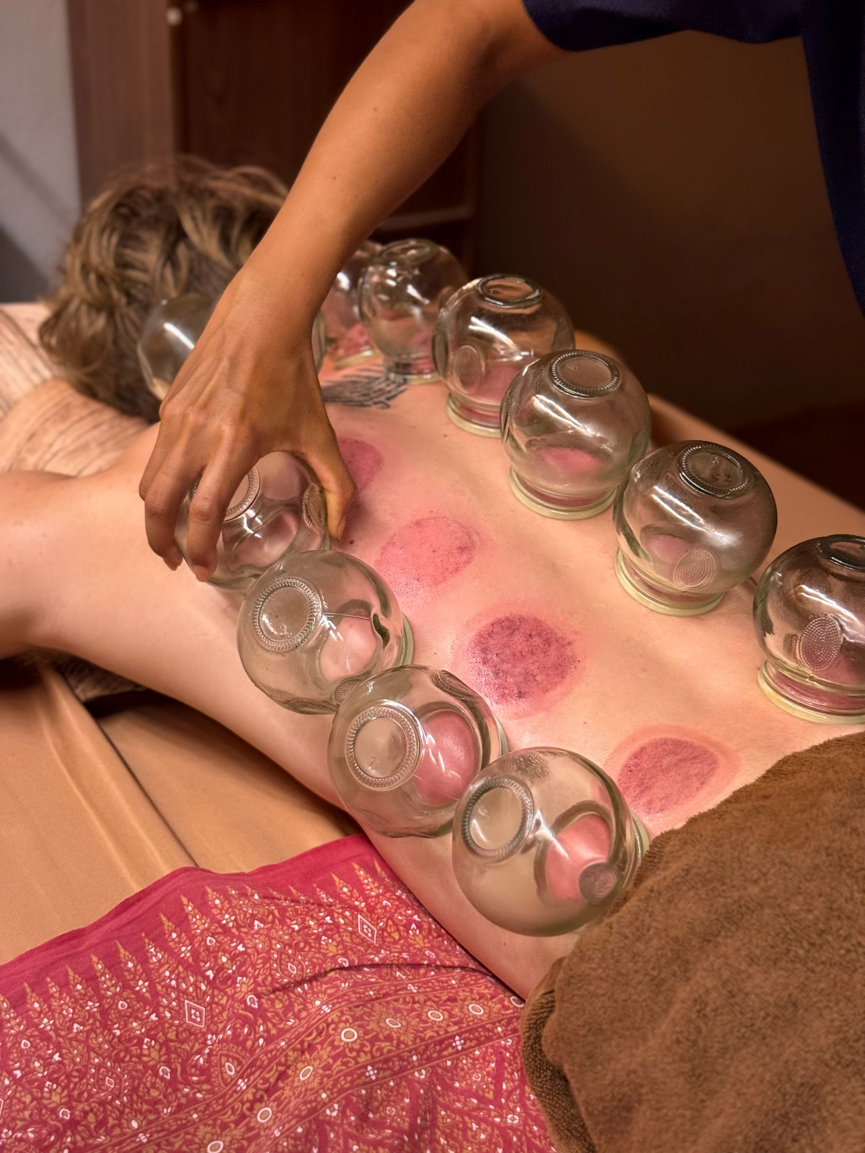Widely used in both traditional and modern therapeutic practices, cupping offers a wide range of benefits, including: • Pain Relief – Helps alleviate chronic pain, especially in the back, neck, and shoulders. • Improved Circulation – Enhances blood and lymph flow, supporting faster recovery and tissue repair. • Detoxification – Encourages the removal of toxins and metabolic waste through lymphatic stimulation. • Reduced Inflammation – Assists in calming inflammation, which is often linked to chronic illness. • Relaxation & Stress Reduction – Induces a calming effect on the nervous system, helping relieve stress and anxiety. • Healthier Skin – May improve conditions such as acne and cellulite by increasing nutrient-rich blood supply to the skin. • Immune System Support – Stimulates the body’s defenses and helps restore energetic balance.